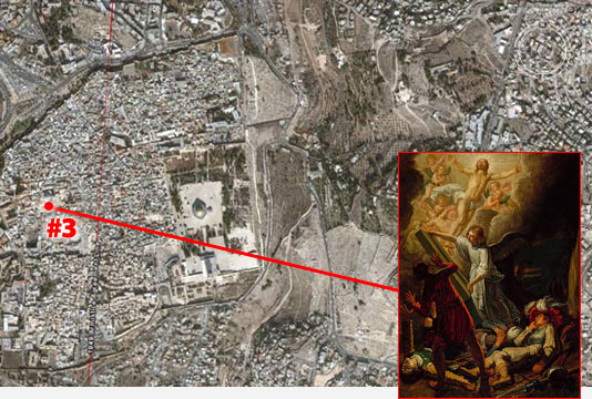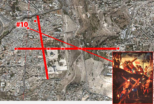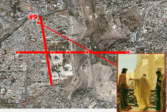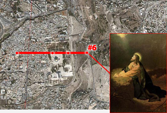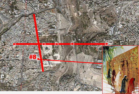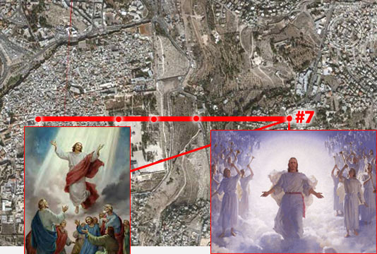 Continue the same line again moving East and you will come very close to the high point of Mount Olives (No. 7) where Jesus ascended to the right side of the Heavenly Father and where His feet will touch down when He returns to planet Earth.